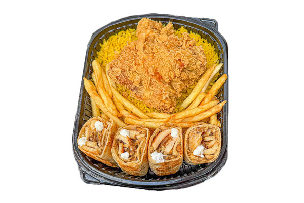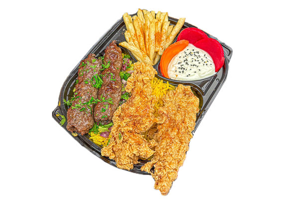2 pieces of strips, 2 pieces of kofta, basmati rice, fries, garlic dip, Lebanese bites