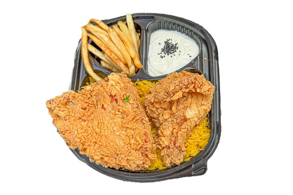 2 pieces of fried chicken, basmati rice, fries, garlic dip, Lebanese bites