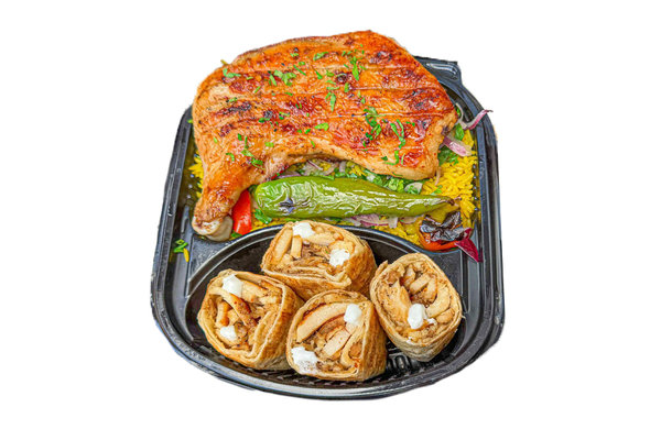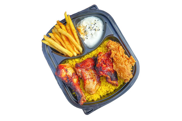 1/4 chicken thigh, chicken shawerma slices, basmati rice, fries, Lebanese bites
