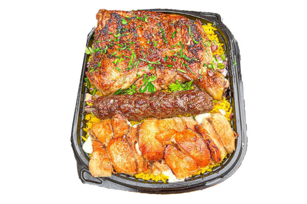 1 chicken thigh, 2 kofta pieces, fries, basmati rice and garlic dip