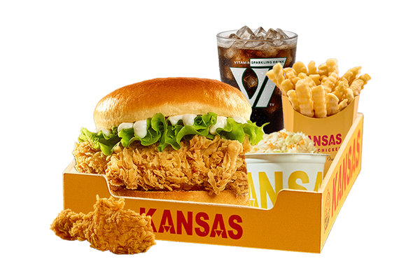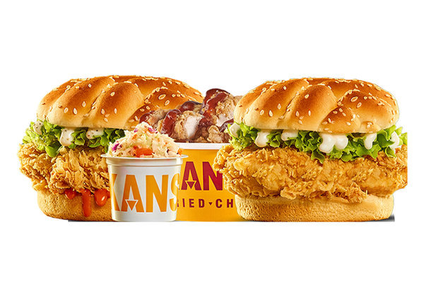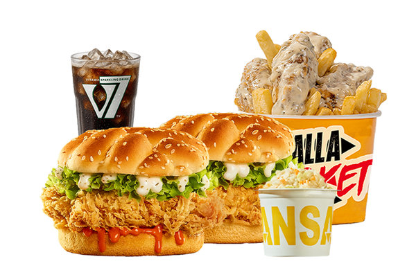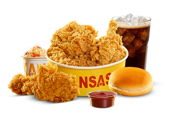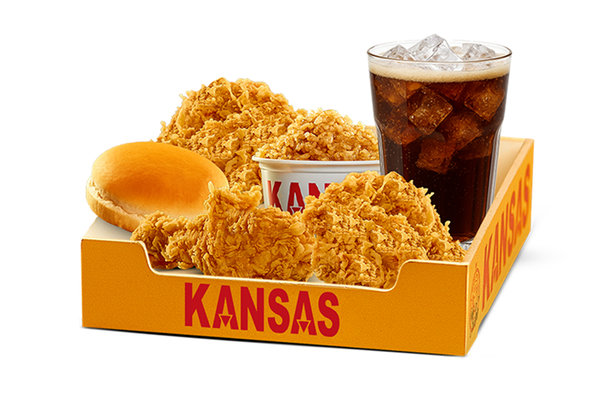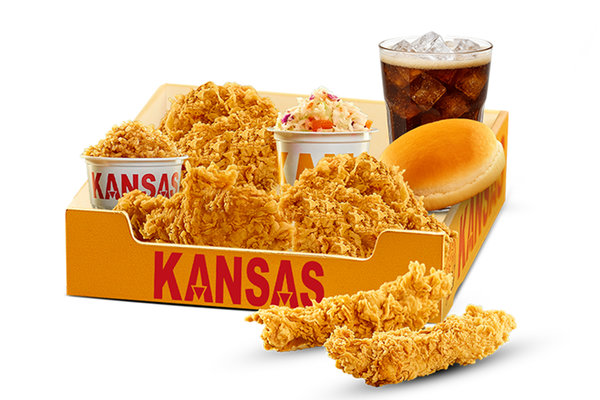 قطعتين دجاج من اختيارك، قطعتين من ستربس، أرز كبير، سلطة كول سلو صغيرة، صوص باربيكيو، كاتشب، خبز، مشروب من اختيارك