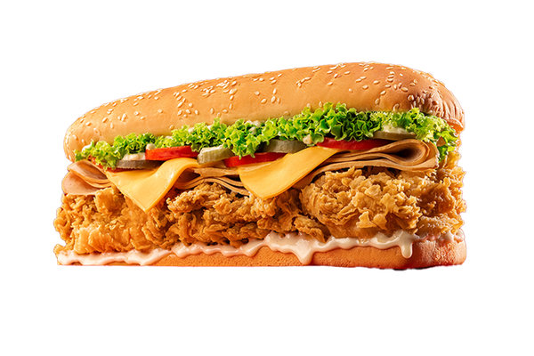 دبل فيليه دجاج مغطي بيف بيكون، مخلل، شرائح جبنة، صوص رانش، صوص عسل حار