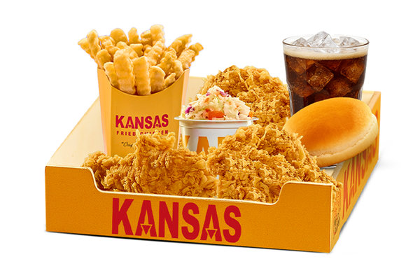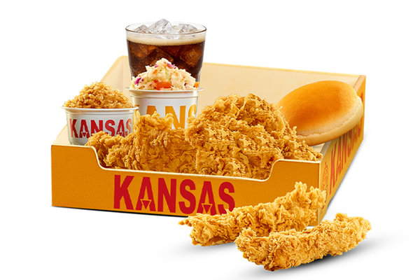 3 قطع تندر، بطاطس مقلية وسط، توست، صوص كنساس الخاص، كول سلو صغير، مخلل أو هالبينو