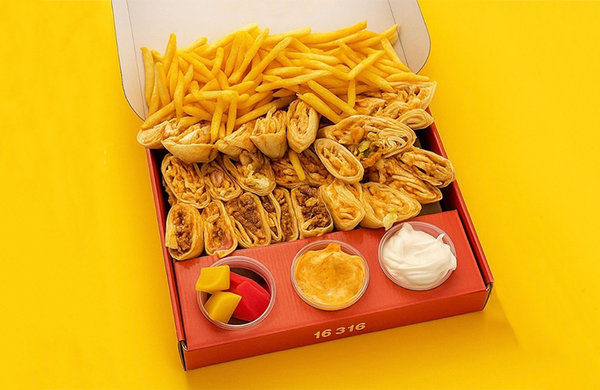 2 ساندوتش شاورما دجاج فرنساوي وسط، 2 ساندوتش فراخ فرنساوي كرانشي وسط، 2 ساندوتش شيش فرنساوي وسط، 1 ساندوتش كفتة لحم ضأني فرنساوي وسط و 1 ساندوتش كفتة دجاج فرنساوي وسط، تقدم مع بطاطس ، ثومية ومخلل