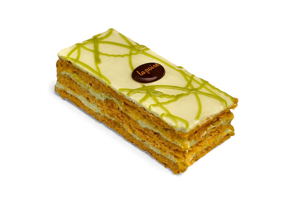 طبقات من الميلفيه المحشو بكريمة الفستق، مزين بكريمة زبدة الفستق، كريمة فستق ناعمة