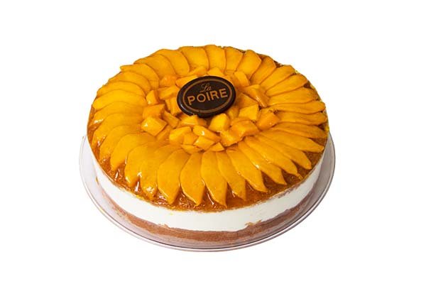 كيك اسبونج فانيلا محشو بكريمة المانجو مغطي بقطع المانجو الفريش و المارينج