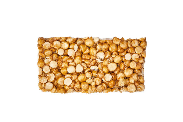 طبقات من الإسفنج الأبيض المحشو بكريمة البندق، مغطاة بالبندق جليز، قطع البندق المكرمل