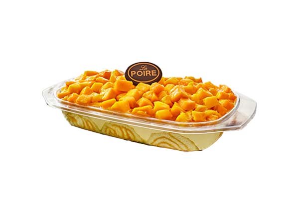 1/2 شوكولاتة 3 طبقات من كيك الشوكولاتة الاسفنجي محشية بكريمة الشوكولاتة، 1/2 فانيليا، 3 طبقات من الكيك الاسفنجي الأبيض محشية بكريمة لابوار، مزينة بقطع المانجو