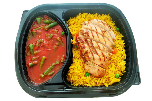 615 سعرة حرارية ، دجاج مشوي، صوص جريفي و مشروم يقدم مع أرز مشكل وخضار