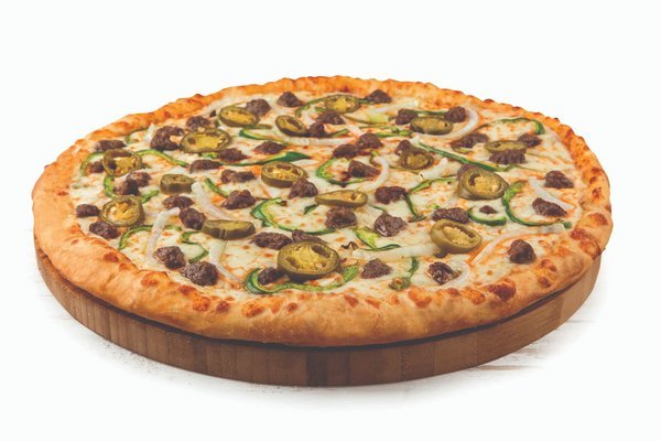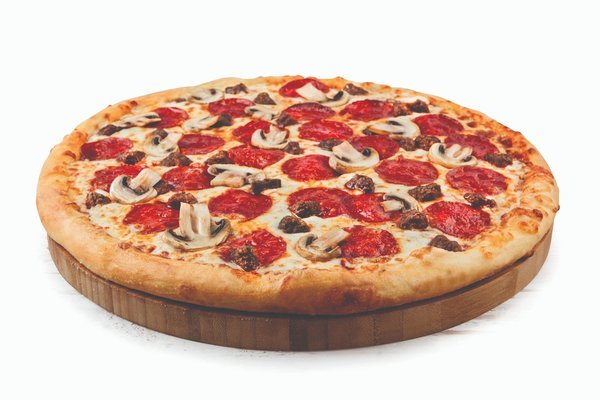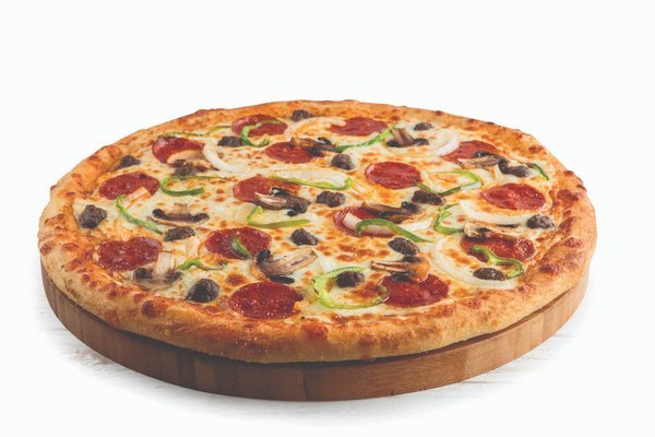 بيبرونى بقرى، سجق ايطالى، لحم بقرى، بصل، فلفل اخضر، مشروم، زيتون اسود، موتزاريلا و صوص دومينوز الخاص