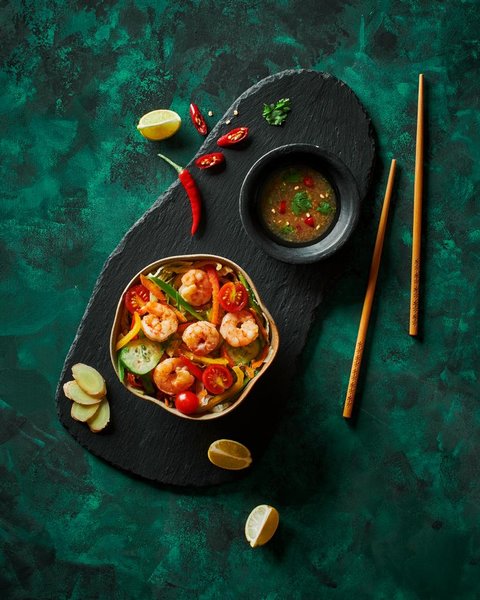 Glass noodles with bell pepper, cucumber, cherry tomato topped with special shrimp Thai dressing