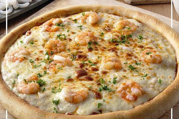 Pizza sauce, mozzarella cheese, onion, shrimp, calamari, anchovies, garlic, thyme, cheese sticks, cheddar cheese, ranch sauce