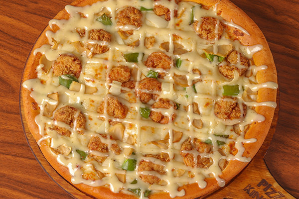 Half medium pan dough, ranch dressing, mozzarella cheese, chicken pizza, with tomato, chili pepper, mushroom, butter & thyme