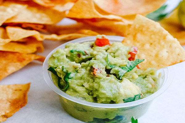 أفوكادو كريمي ، طماطم مقطعة ، بصل أحمر ، كزبرة طازجة وعصير ليمون. تقدم مع ناتشوز الذرة