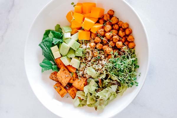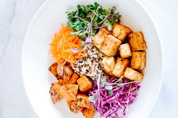 أرز بني، كينوا، توفو مشوي، بطاطا حلوة مشوية، كرنب أحمر، جزر، كزبرة طازجة، خضار، خيار الصوص: صوص البحر الأبيض المتوسط،، كريمة الكاجو، مانجو حار، بونزو، فول سوداني حار
