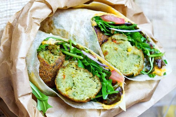 فلافل مصنوعة يدويًا من فاصوليا عريضة، حمص، جزر، جرجير طازج، طماطم وبصل احمر ملفوفة في خبز سوري مسطح