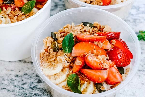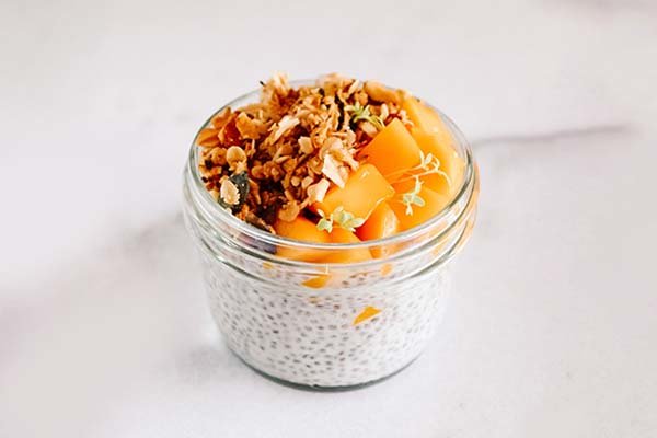 بودينج كريمي مصنوع من بذور الشيا وحليب جوز الهند والعسل و حبهان ومغطاة بالفواكه الموسمية والجرانولا سوبر فود منزلية الصنع