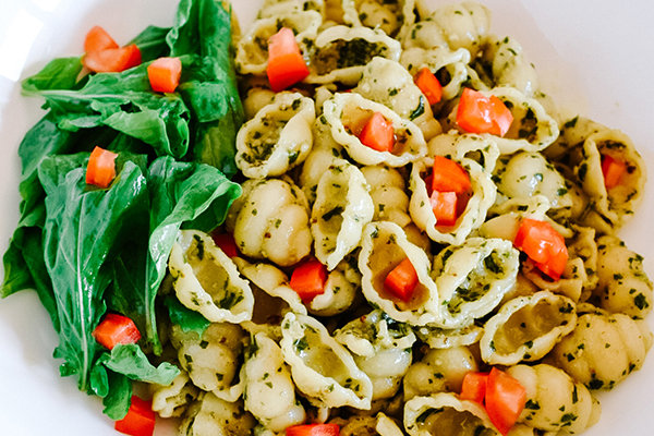فاصوليا حمراء و سوداء بصلصة طماطم متبلة، فلفل ألوان مشوي و بصل، صلصة كريمة الكاجو، سلطة طماطم حلوة متبلة تقدم مع أرز بني