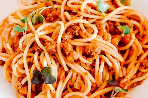 صوص بولونيز مطبوخة ببطء محضرة من اللحم المفروم النباتي والفطر والجزر والبصل والطماطم