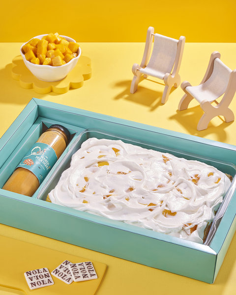 كيك فانيليا مع خليط لبن عبارة عن (لبن مبخر، لبن مكثف، كريمة فريش وقطع مانجو) تكفي من 6 الي 8 افراد، مقاس 20* 26 سم