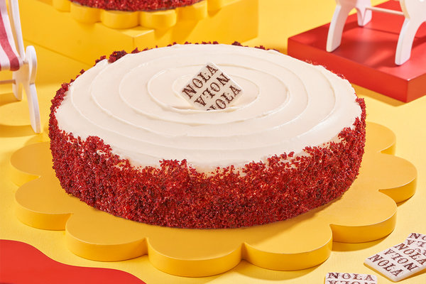 كيك احمر وحشو كريمة الجبنة من الداخل والخارج مغطي بقطع ريد فيلفت كيك، تكفي 3 - 4 اشخاص